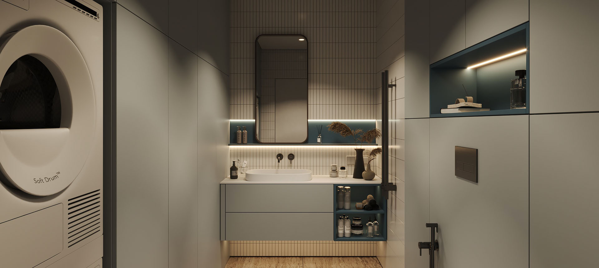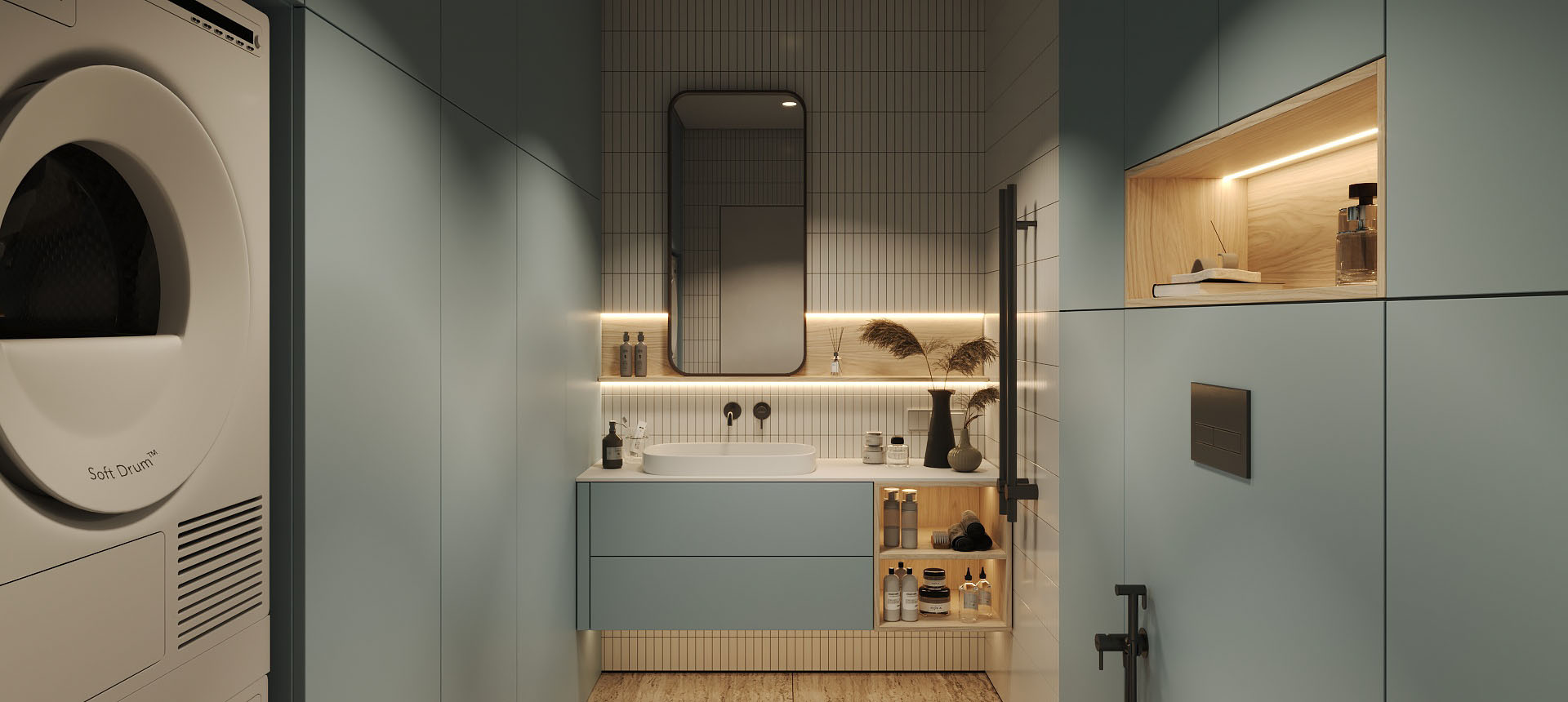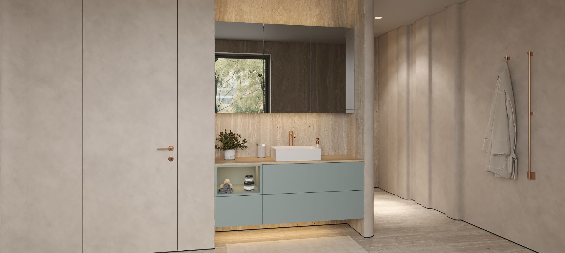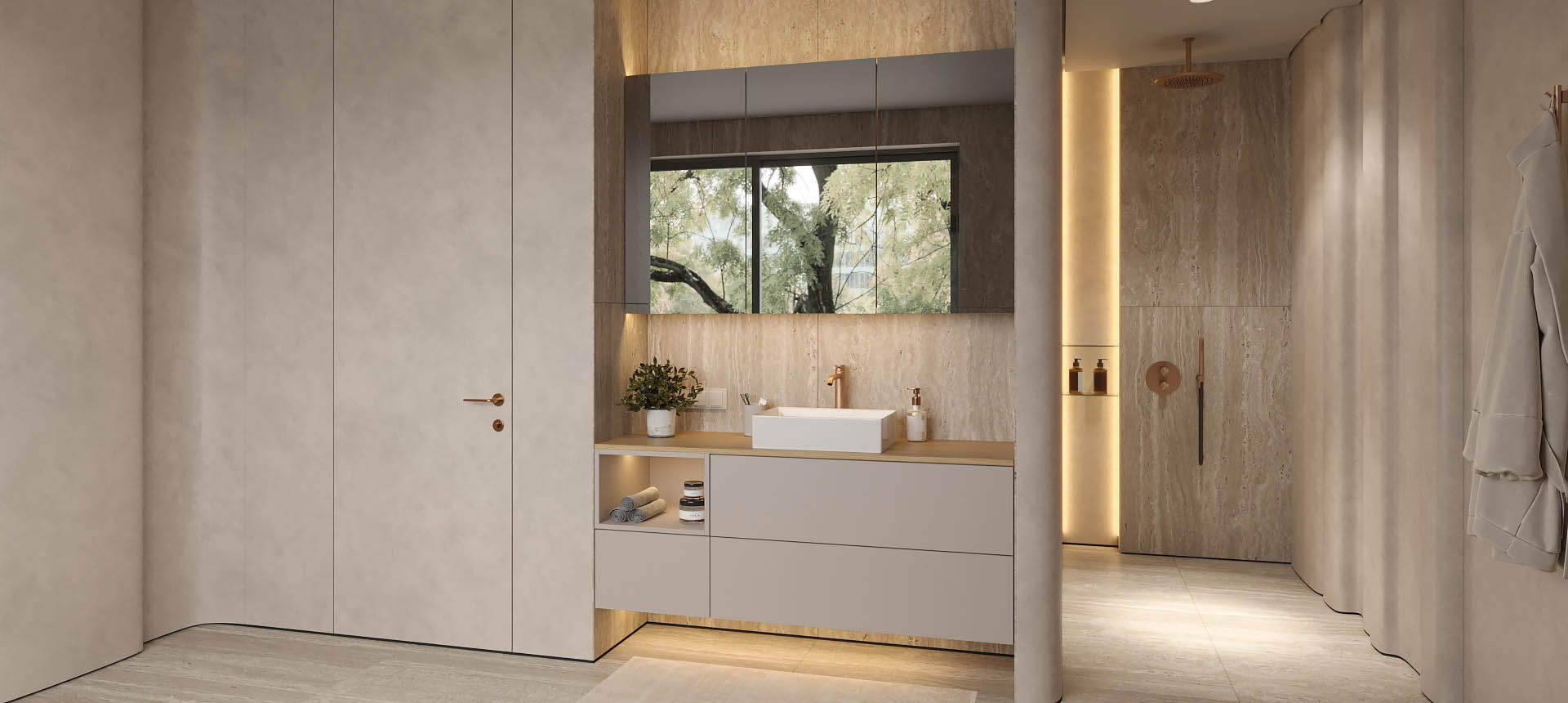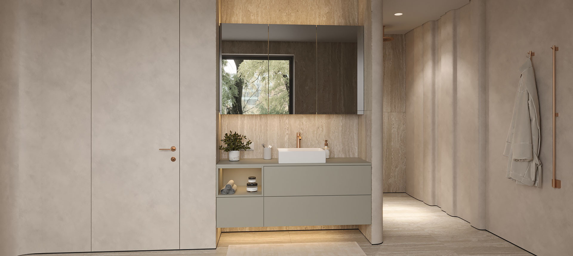 «У меня все проекты с компанией («Стильные Кухни и Интерьеры) были хорошие, но мебелью в ванную комнату я довольна больше всего на свете. Мне сделали тумбу под раковину, две навесные колонки по бокам, зеркало с подсветкой, а также встроенный шкаф напротив. Из-за высоты потолков и размеров шкафов было непросто спроектировать все так, как надо: были опасения, что дверцы ослабнут, что тяжелые дверцы нельзя будет открывать одним легким нажатием. Но в итоге в фасады добавили направляющие, которые их усиливают. И еще удалось сделать эти высокие двери с механизмом push-to-open. У меня не очень большая площадь ванной, поэтому хотелось обойтись без лишних деталей, в том числе и выступающих ручек, которые я бы постоянно задевала»,