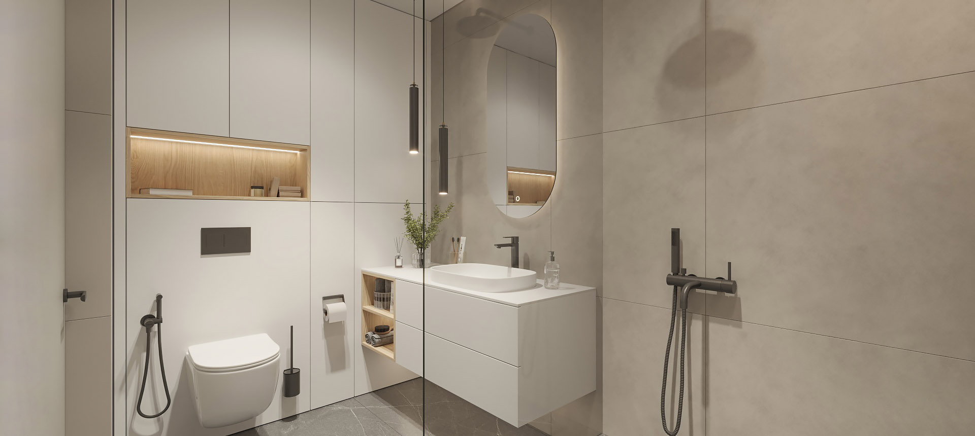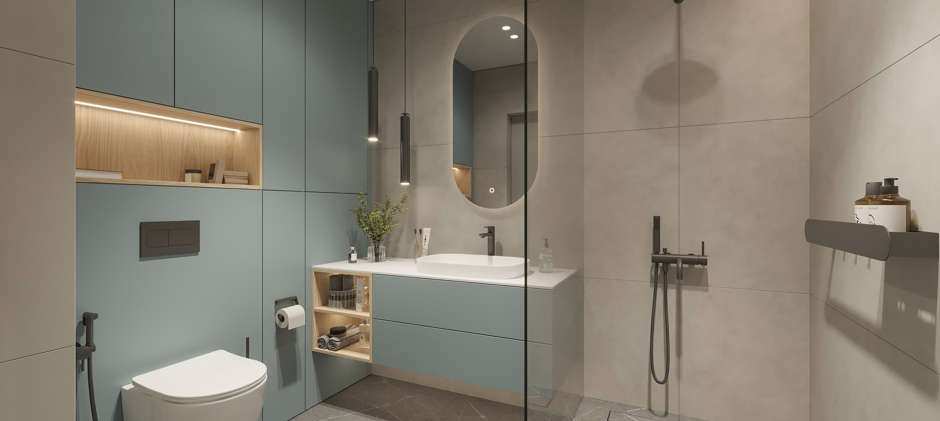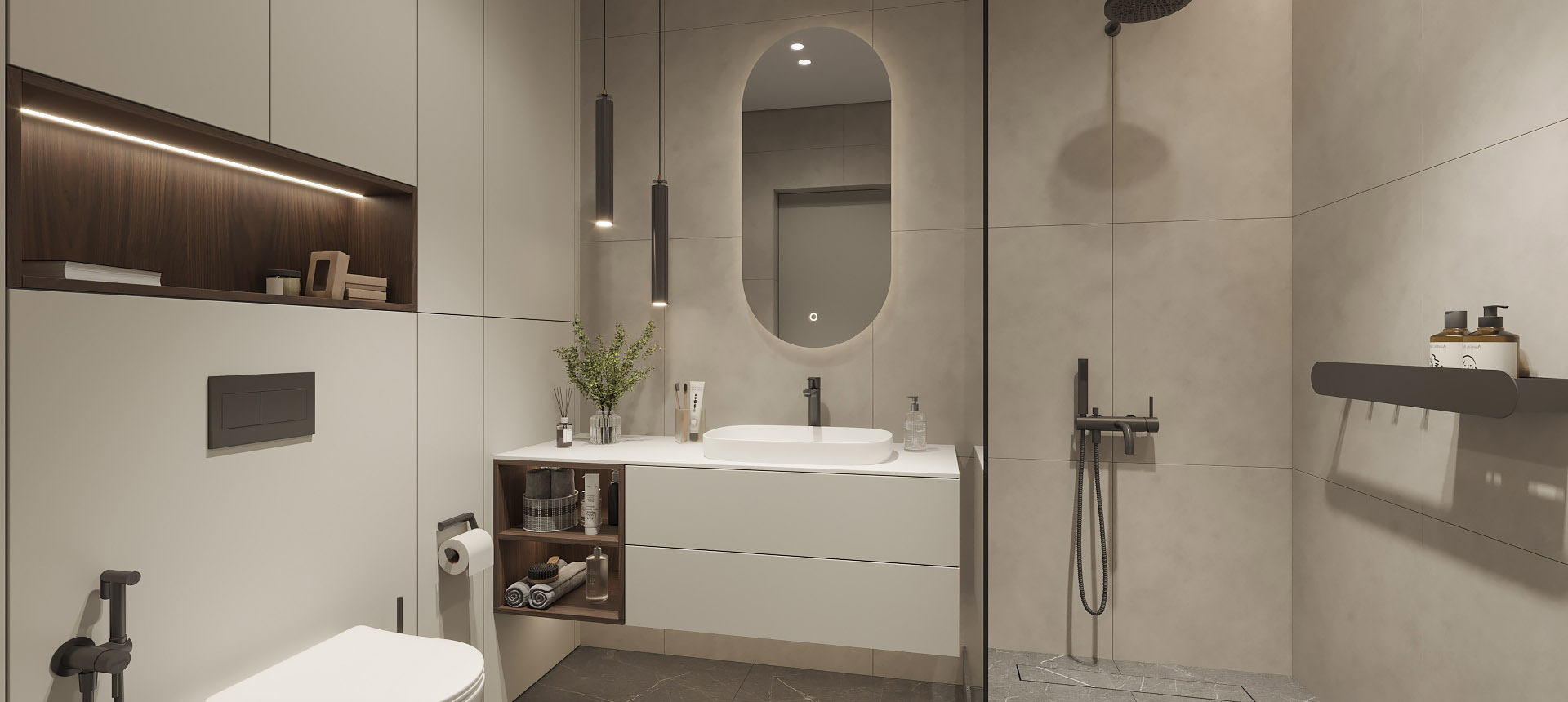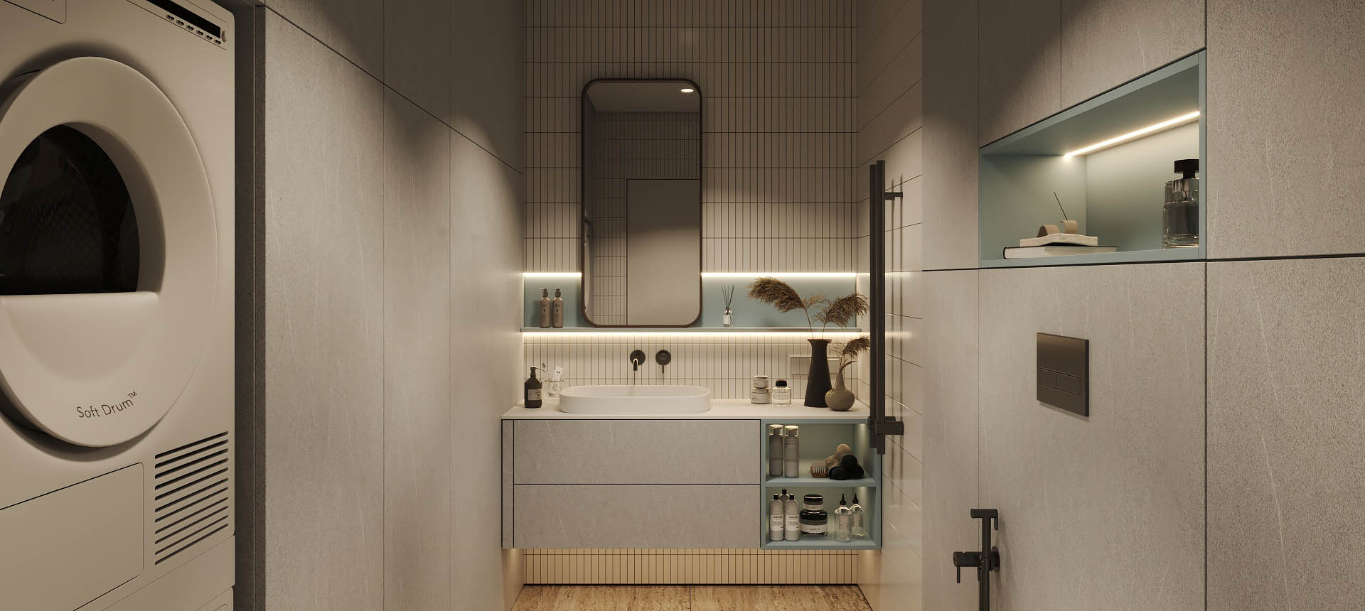 «У меня все проекты с компанией («Стильные Кухни и Интерьеры) были хорошие, но мебелью в ванную комнату я довольна больше всего на свете. Мне сделали тумбу под раковину, две навесные колонки по бокам, зеркало с подсветкой, а также встроенный шкаф напротив. Из-за высоты потолков и размеров шкафов было непросто спроектировать все так, как надо: были опасения, что дверцы ослабнут, что тяжелые дверцы нельзя будет открывать одним легким нажатием. Но в итоге в фасады добавили направляющие, которые их усиливают. И еще удалось сделать эти высокие двери с механизмом push-to-open. У меня не очень большая площадь ванной, поэтому хотелось обойтись без лишних деталей, в том числе и выступающих ручек, которые я бы постоянно задевала»,