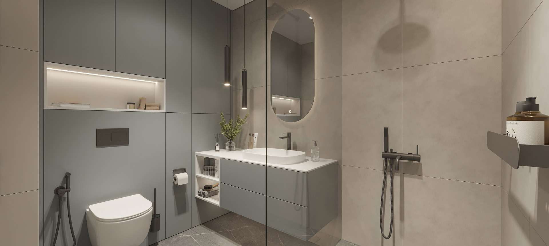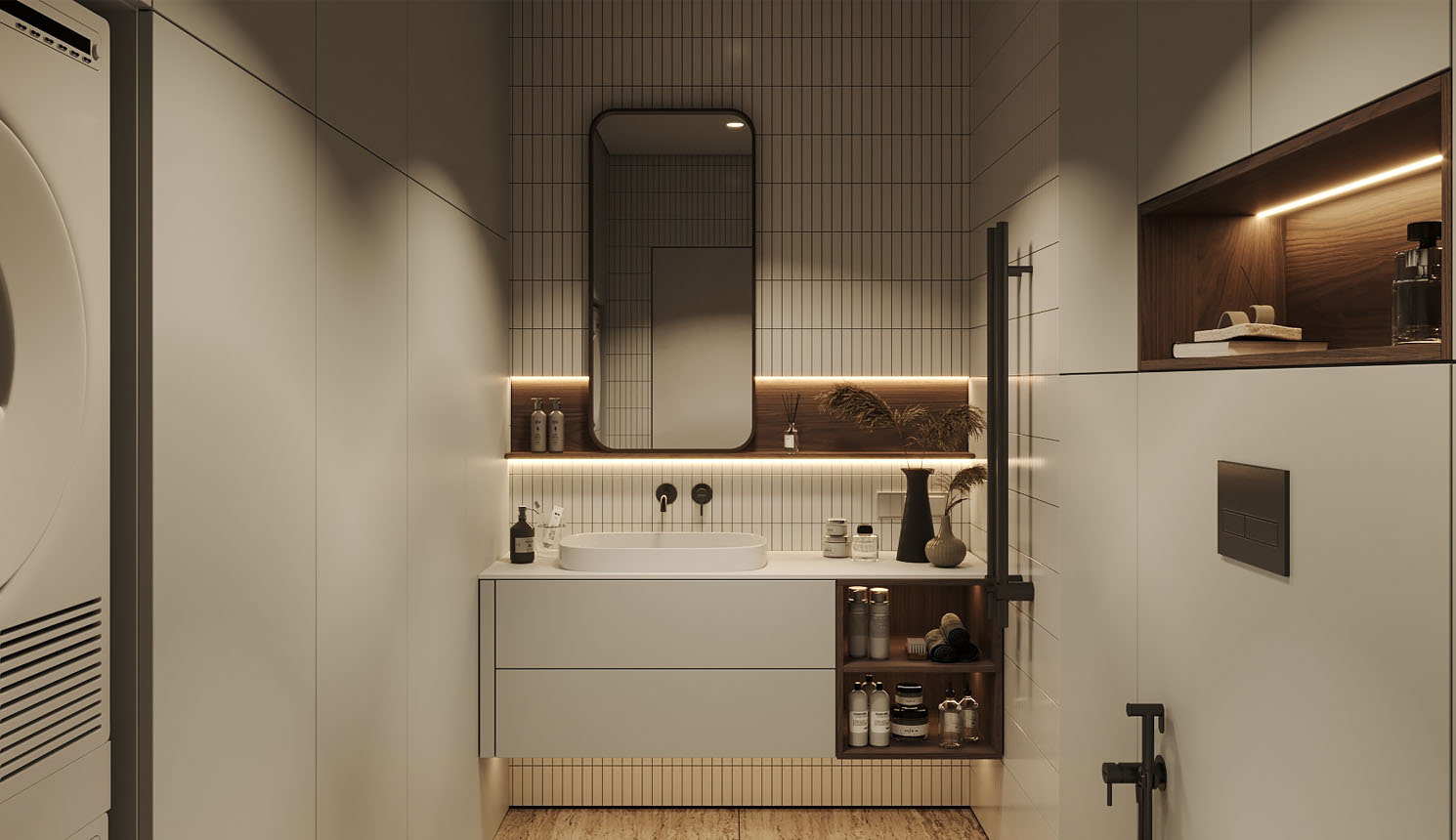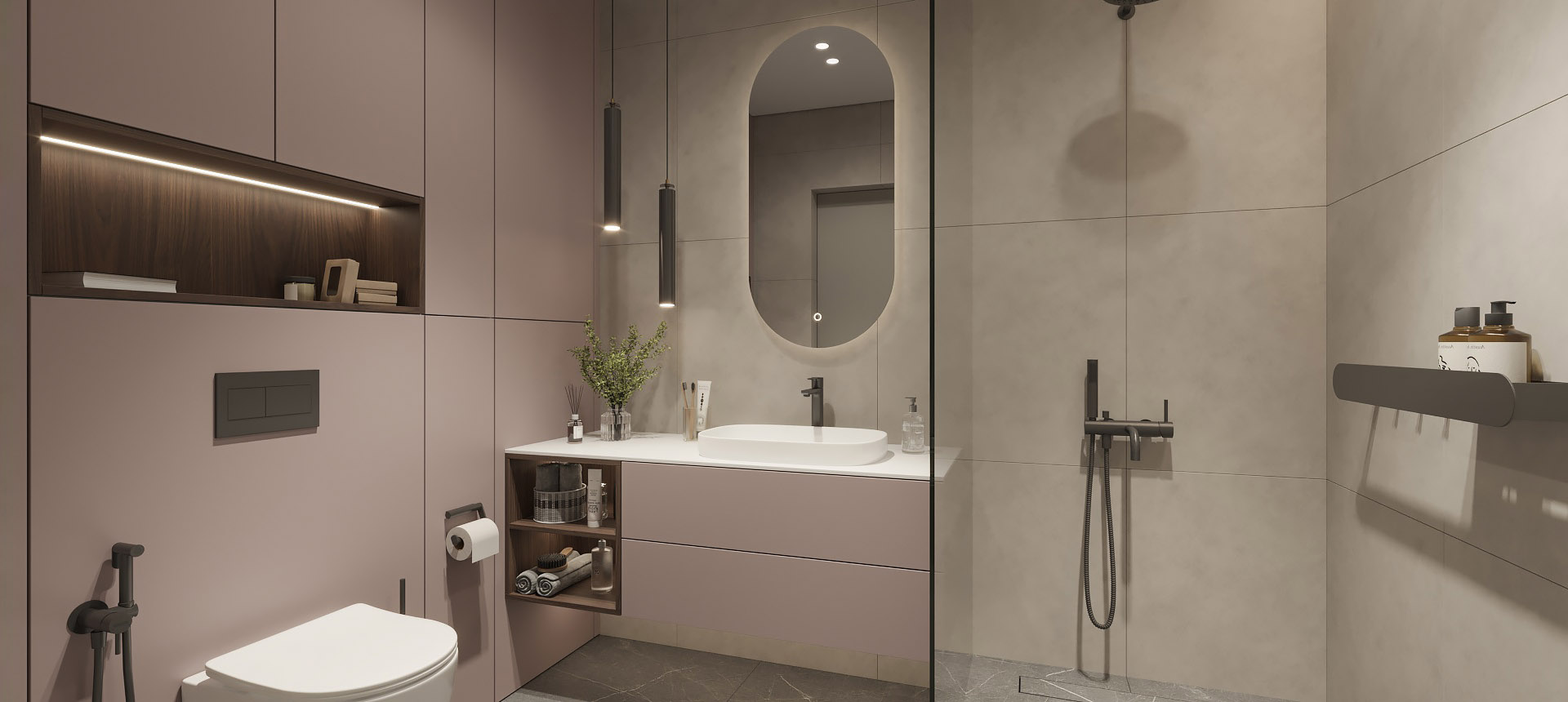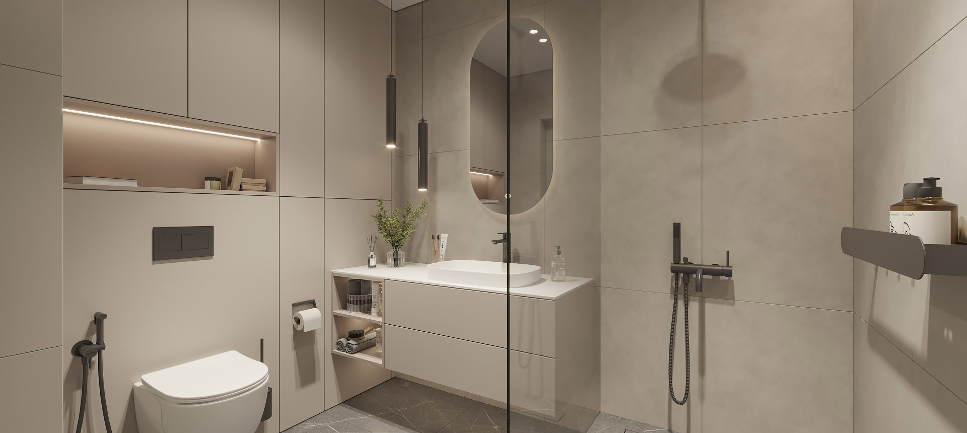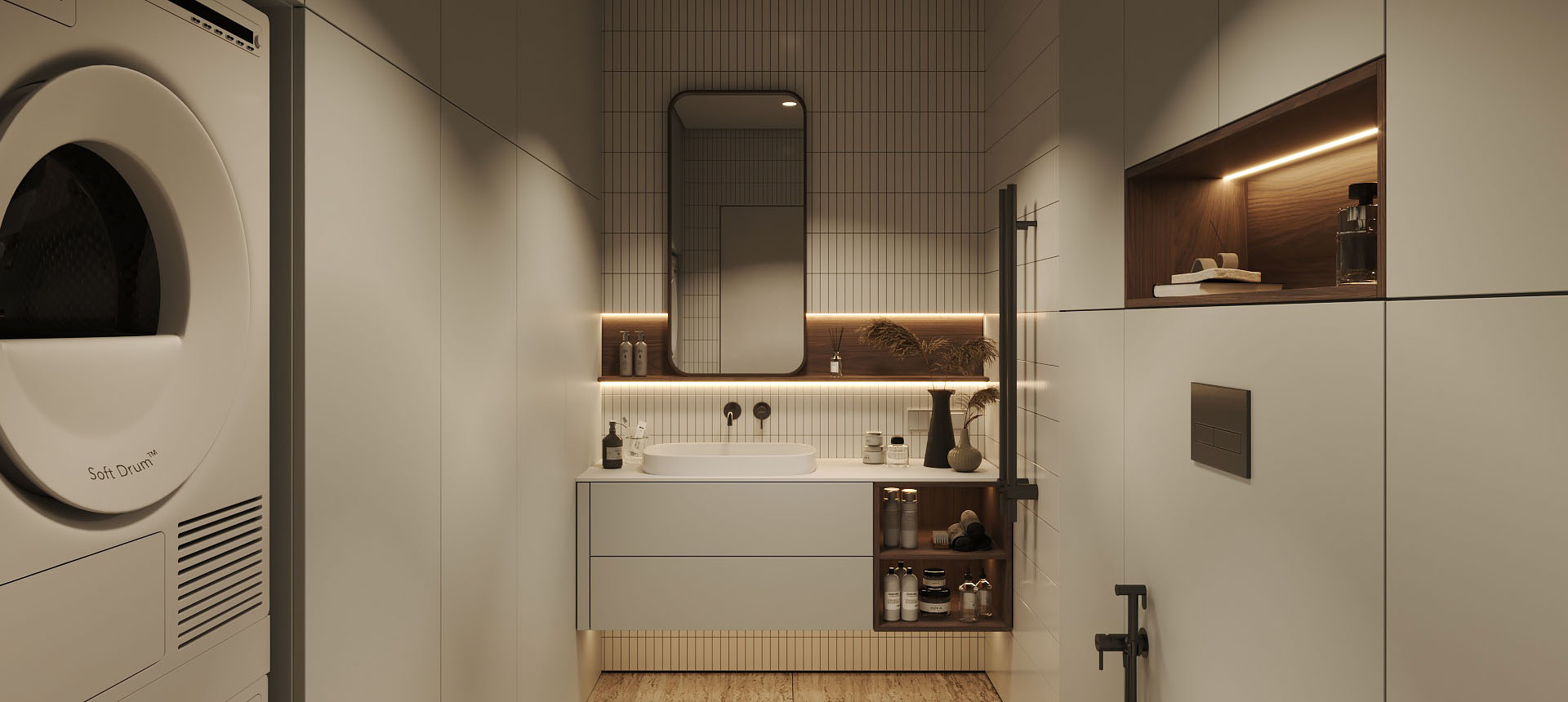 «У меня все проекты с компанией («Стильные Кухни и Интерьеры) были хорошие, но мебелью в ванную комнату я довольна больше всего на свете. Мне сделали тумбу под раковину, две навесные колонки по бокам, зеркало с подсветкой, а также встроенный шкаф напротив. Из-за высоты потолков и размеров шкафов было непросто спроектировать все так, как надо: были опасения, что дверцы ослабнут, что тяжелые дверцы нельзя будет открывать одним легким нажатием. Но в итоге в фасады добавили направляющие, которые их усиливают. И еще удалось сделать эти высокие двери с механизмом push-to-open. У меня не очень большая площадь ванной, поэтому хотелось обойтись без лишних деталей, в том числе и выступающих ручек, которые я бы постоянно задевала»,