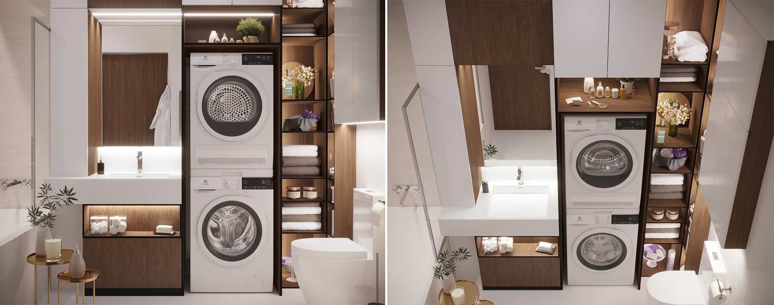 - высокие встроенные секции с местом для стиральной и сушильной машины, полками для хранения,