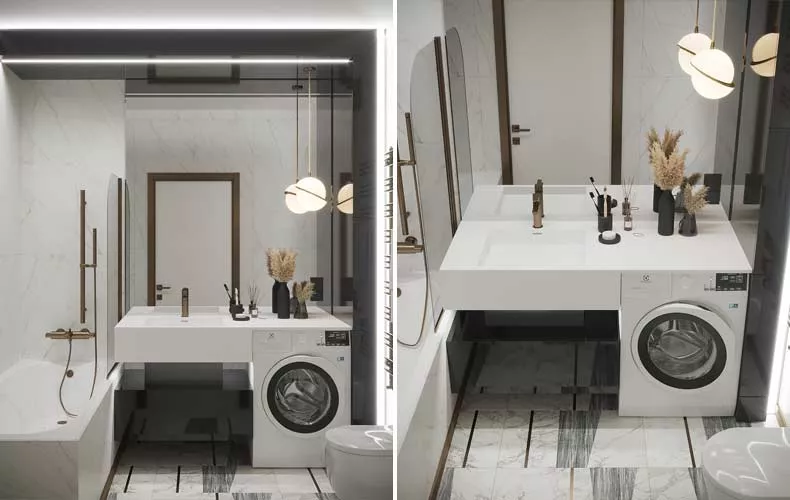 - столешница с интегрированной раковиной и лаконичным однорычажным смесителем,