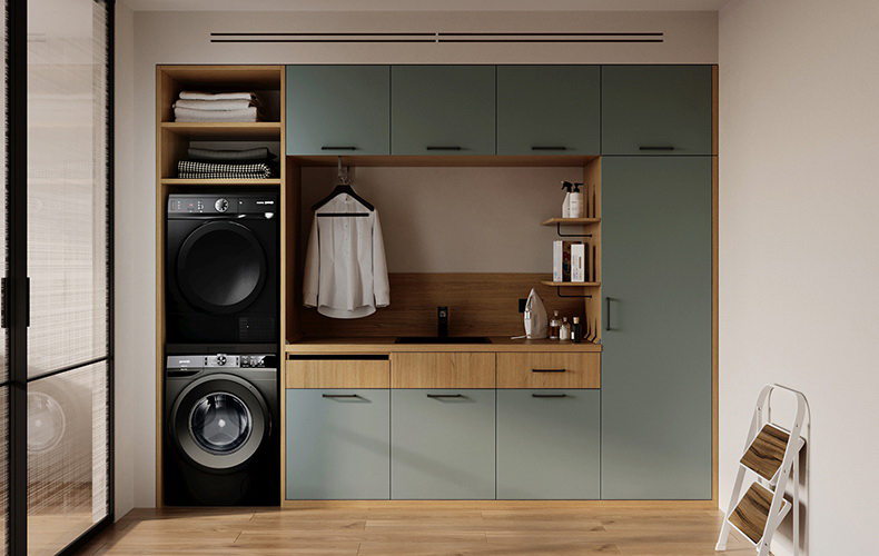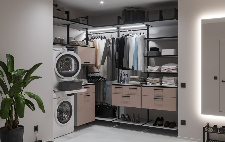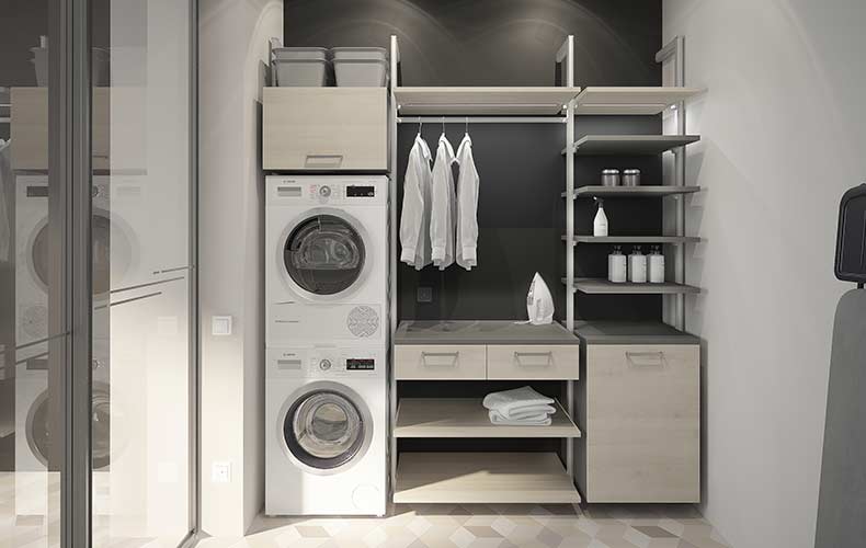 Тщательно продуманная планировка помещения позволит обустроить небольшое по площади пространство под хранение и стирку белья. Для оснащения прачечной комнаты используются стеллажная система «Stilos» с открытыми полками и выдвижными ящиками. Предусмотрены встроенная гладильная доска, штанги для вешалок и ниша для установки стиральной машины. Мебель для прачечной изготовлена из устойчивых к воздействию влаги и высоких температур материалов.