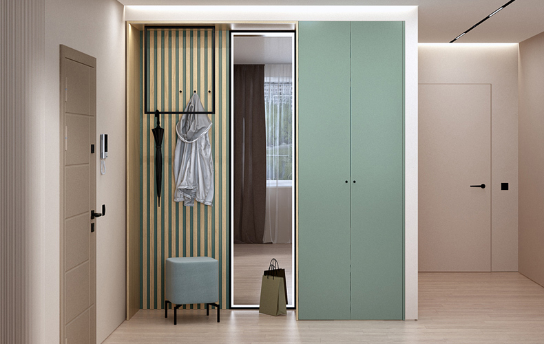 В прихожей мы рекомендуем разместить вместительный шкаф с раздвижными или распашными фасадами. Он необходим для хранения и ежедневного использования верхней сезонной одежды и обуви. К боковой стенке шкафа можно предусмотреть композицию с зеркалом и ящиками. Также прихожие могут дополняться пуфами. Видимые крючки для одежды могут обрамляться рамкой с вставкой из искусственной кожи, а под нее можно заказать тумбу с подушкой для сиденья из такой же кожи, выбрав цвет по каталогу.