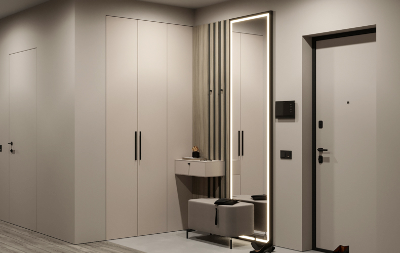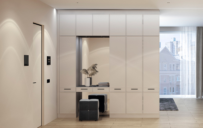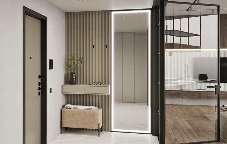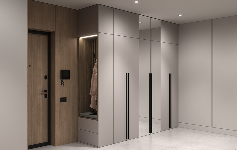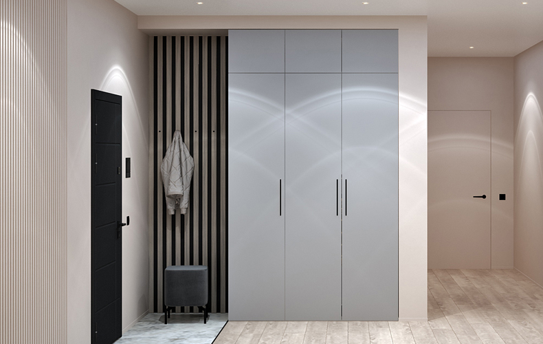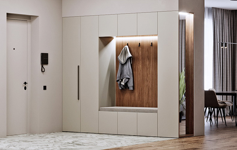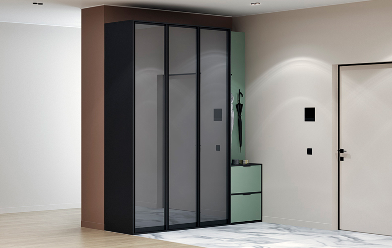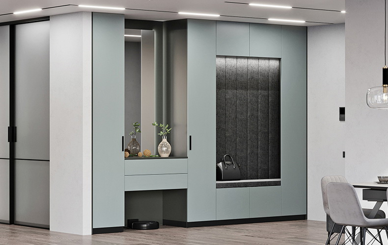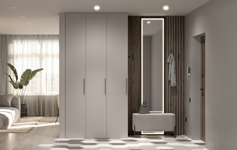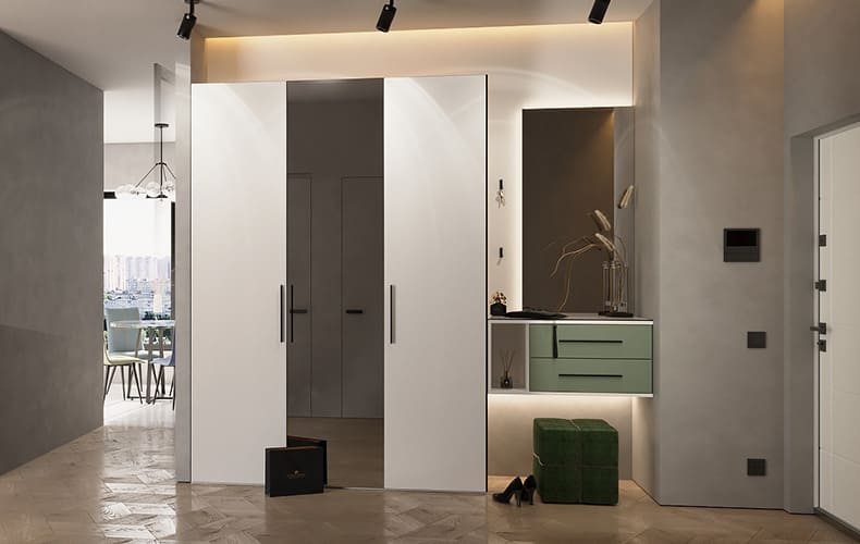 Прихожая 12 - комплект мебели в прихожую с высоким двухдверным шкафом и стеновой панелью в светло-изумрудных и древесных тонах. В качестве хранения сезонных вещей в прихожей есть шкаф со всеми необходимыми полками, штангами и системами хранения. В центре размещается зеркало во всю высоту шкафа, а слева расположена декоративная стеновая панель и каркасная вешалка для одежды. Прихожая выглядит стильно, современно и компактно.