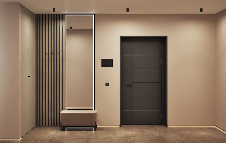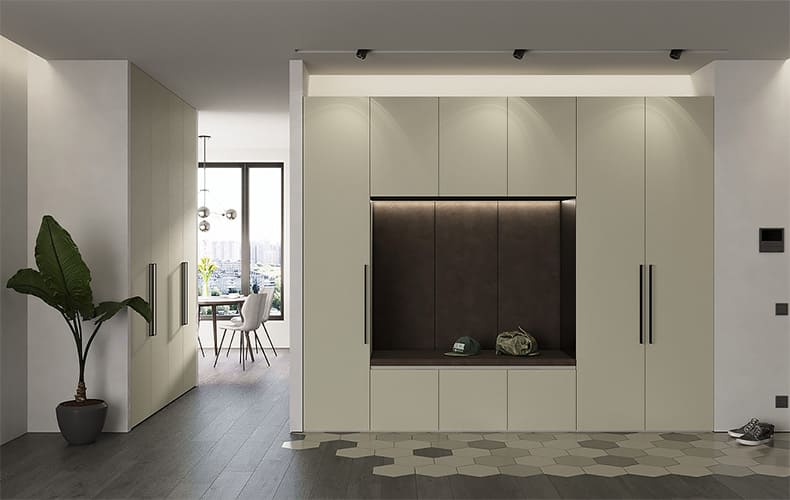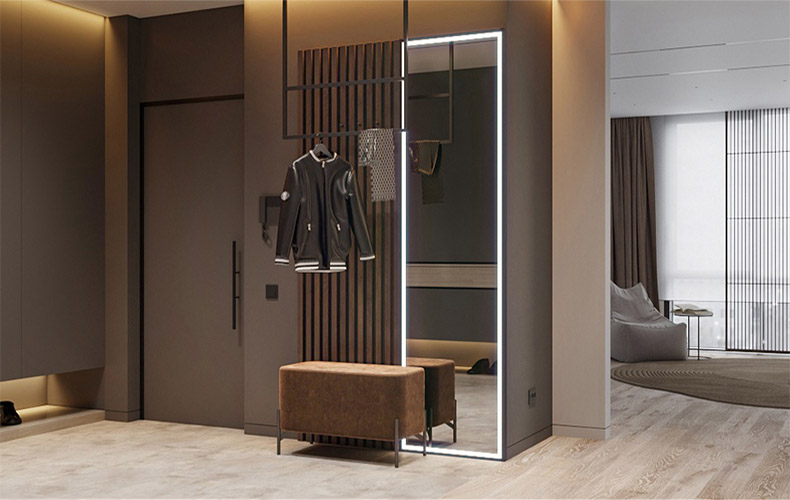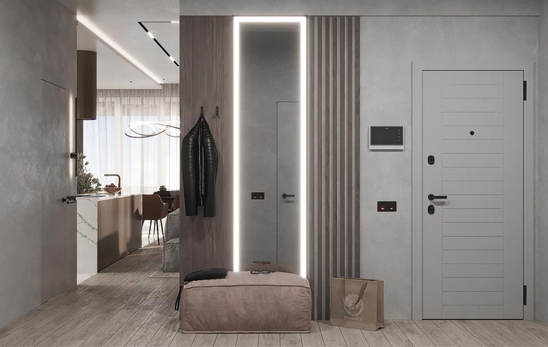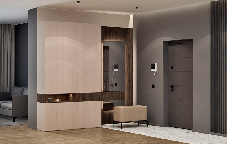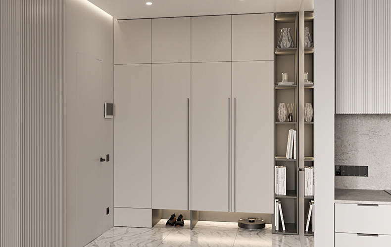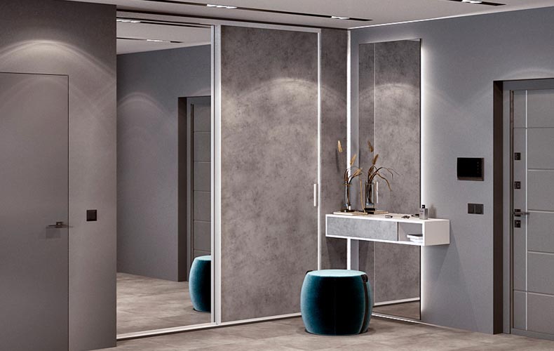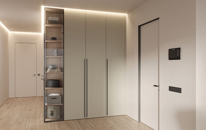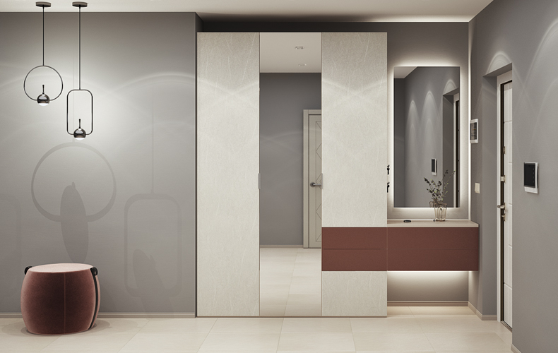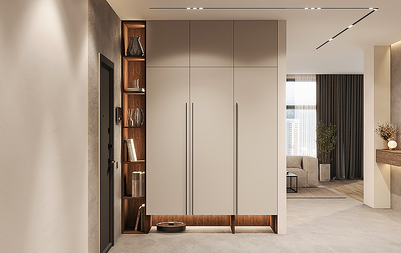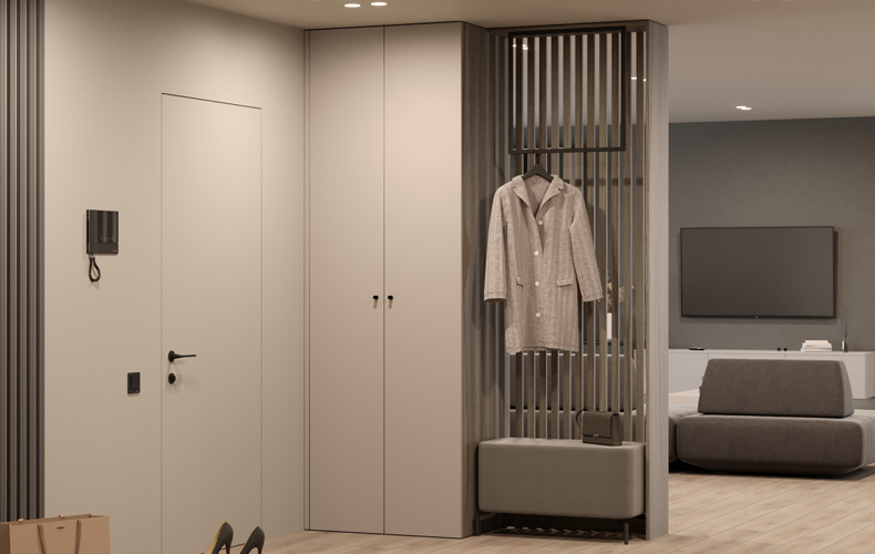 Прихожая 12 - комплект мебели в прихожую с высоким двухдверным шкафом и стеновой панелью в светло-изумрудных и древесных тонах. В качестве хранения сезонных вещей в прихожей есть шкаф со всеми необходимыми полками, штангами и системами хранения. В центре размещается зеркало во всю высоту шкафа, а слева расположена декоративная стеновая панель и каркасная вешалка для одежды. Прихожая выглядит стильно, современно и компактно.