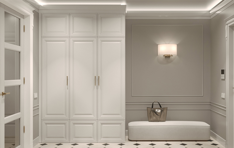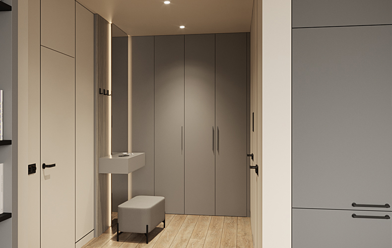 Прихожая 33 представлена встроенным антресольным шкафом с нишей и открытыми полками. Есть подсветка полок, мягкая сидушка и панели для ниши. За распашными дверями располагаются полки, штанги, обувницы. Есть антресольные полки для сезонного хранения.