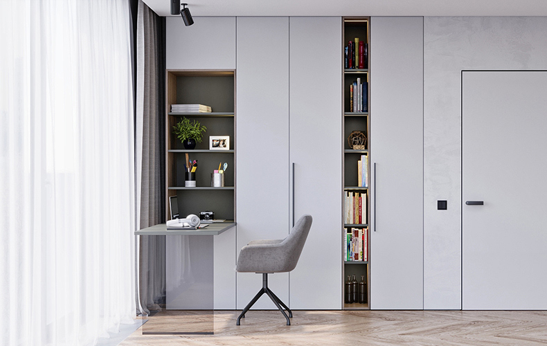 Распашной шкаф в спальню представлен в белом матовом цвете. Есть также модули с открытыми полками и навесными шкафами для хранения. Сам шкаф достаточно вместителен - содержит полки, ящики и штанги для удобного хранения вещей. Модульная секция с открытыми полками и ящиками в тёмно-серых тонах используется в качестве консольного столика или прикроватной тумбы.