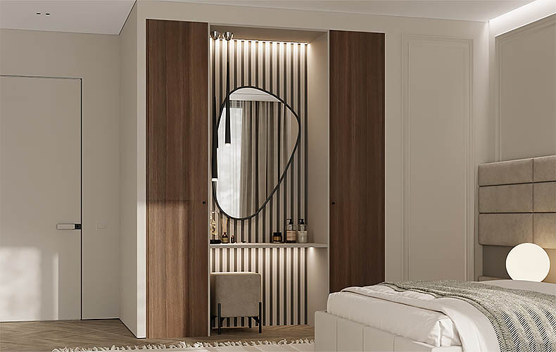 В узкой прихожей можно расположить высокий антресольный шкаф с распашными дверями по одной из стен. Такой шкаф в качестве мебели для прихожей необходим для хранения и ежедневного использования верхней сезонной одежды и обуви. Также будет полезна открытая секция с полками, где можно расположить элементы декора, ключницы и другие мелкие принадлежности. Как правило прихожие не имеют окон, поэтому не стоит забывать про подключение локальной подсветки.
