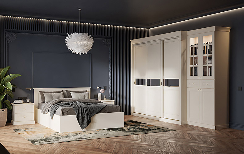 Трёхдверный встроенный шкаф-купе хорошо подойдёт для спальни. Шкаф можно вписать в нишу любой глубины, дополнить необходимой фурнитурой и подсветкой. В наполнении шкафа-купе есть и ящики и множество полок для хранения, вешало и обувницы.