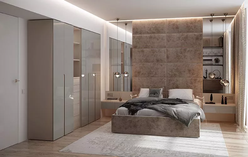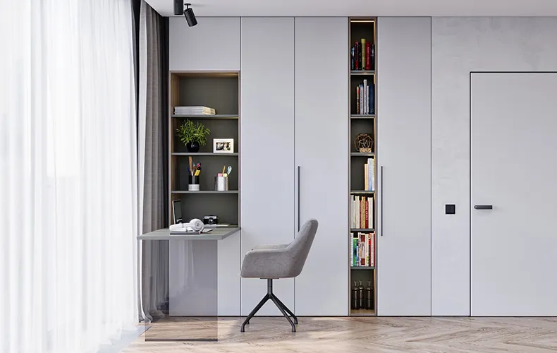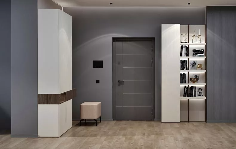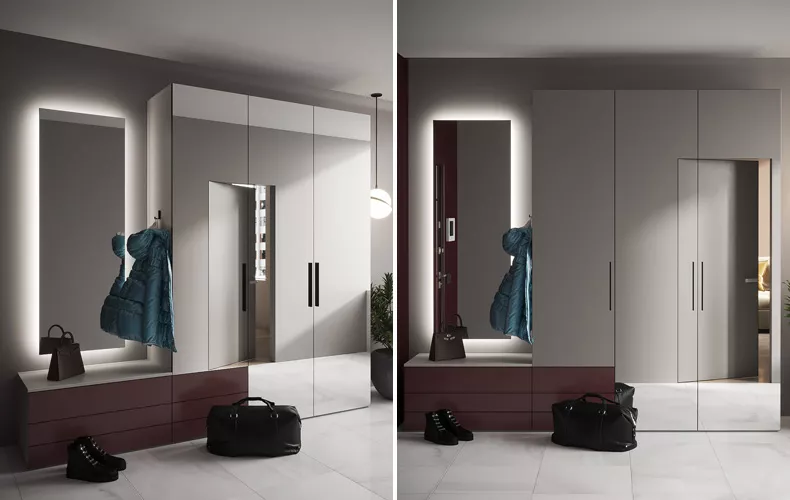 В небольшой прихожей расположены высокий шкаф с дверями Альто с панелью из реек и зеркалом. В качестве хранения сезонных вещей в прихожей предусмотрен трёхдверный шкаф со всеми необходимыми полками, штангами и системами хранения. В центре размещается зеркало во всю высоту шкафа, а справа расположена декоративная панель из реек.
