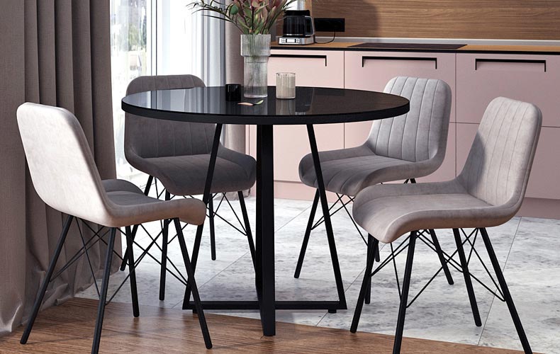 Стулья для кухни Рипозо 2 в бежевом цвете. Модель отличается от стульев Рипозо 1 отсутствием дополнительных элементов крепления у ножек. Каркас стульев представляет собой единую конструкцию в цвете чёрный муар. Стулья очень удобны для использования именно в обеденных группах на кухне