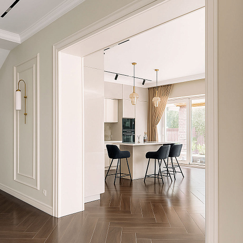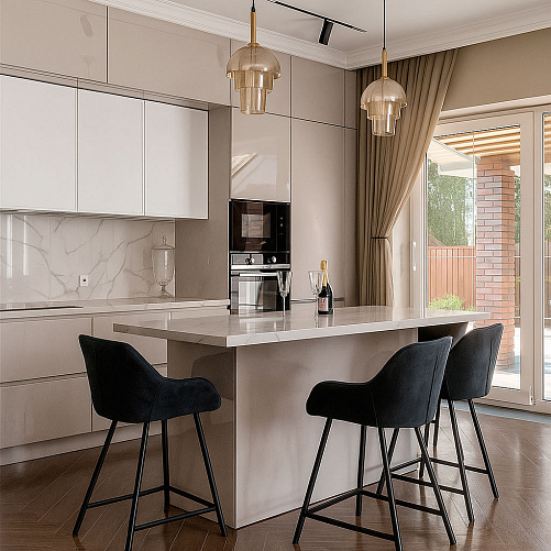 Эта кухня — настоящий оазис света и уюта! Светлые тона создают атмосферу свежести и гармонии, а просторный остров с мраморной столешницей приглашает собираться всей семьей за завтраком или вечерними разговорами. Большие окна наполняют пространство солнечным светом, а мягкие шторы добавляют тепла и уюта. Здесь каждый элемент продуман до мелочей, чтобы создавать комфорт и вдохновлять на кулинарные подвиги. Эта кухня — идеальное место для радостных встреч и приятного времяпрепровождения!