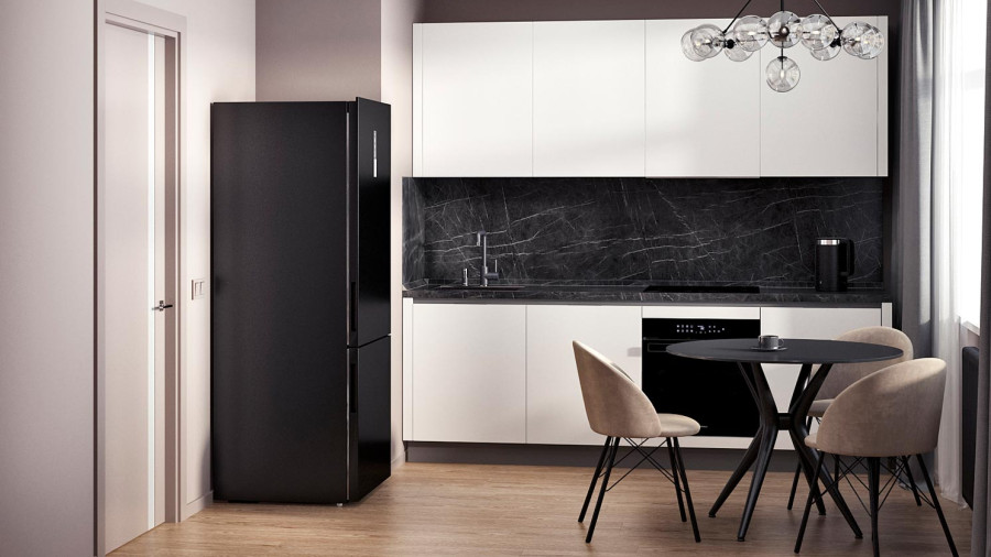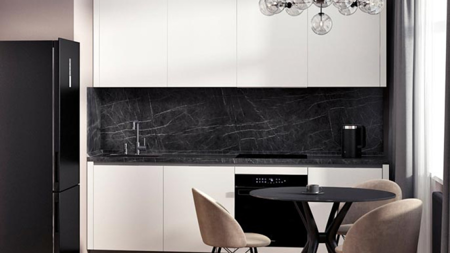 Контрастное сочетание белого и черного цветов — оригинальное решение для интерьера, которое всегда актуально. Из-за преобладания белого цвета даже маленькое помещение будет выглядеть больше. Черные столешница и фартук образуют нишу в рабочей зоне, от этого кухня смотрится еще больше. Компактный гарнитур позволяет разместить все необходимые принадлежности в шкафах и ящиках, оснастить кухню встроенной техникой и готовить с комфортом и удовольствием.