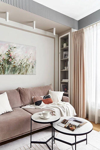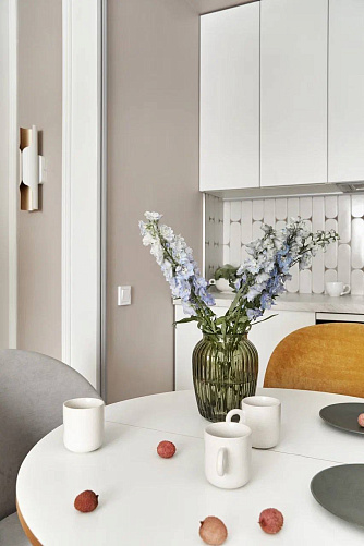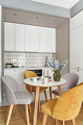 Светлые цвета, современная мебель, классические молдинги и «елочка» из ламината — продуманное сочетание элегантного и современного. Вся мебель — от компании «Стильные Кухни и Интерьеры».