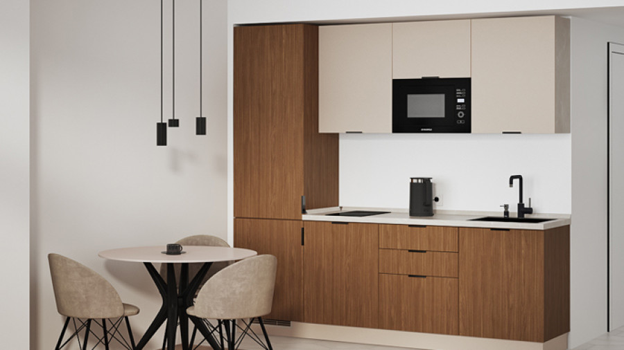 «Фабио Комфорт» сет 23 — прямая кухня с верхними кремовыми шкафами и нижними шкафами и колонной орехового оттенка. Холодильник — встроенный и прячется за фасадами колонны. Бытовая техника встроена в верхние шкафы. Несмотря на кажущуюся компактность, эта кухня с верхними шкафами под потолок вмещает множество удобных мест для хранения и скрывает в себе богатый функционал. Благодаря удачной цветовой комбинации это интерьерное решение визуально расширяет пространство и делает потолок визуально выше.