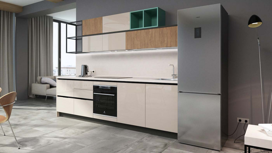 Гарнитур Лучидо, выполненный в минималистичном дизайне, будет эффектно смотреться на кухне в современной стилистике. Прямая конструкция позволит разместить мебель вдоль стены, что очень удобно в условиях ограниченного пространства. В оформлении использованы оригинальные сочетания фактур и оттенков: кремовые фасады из глянцевой плиты, навесные шкафы с древесным декором Фабио, металлические элементы, полки из ЛДСП Egger в ярко-зелёном цвете. Глянцевые поверхности Acrylux облицованы акриловым пластиком, устойчивым к повреждениям и выцветанию. Кухонный гарнитур оснащён встроенной техникой и подсветкой.