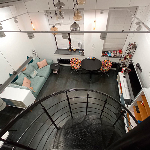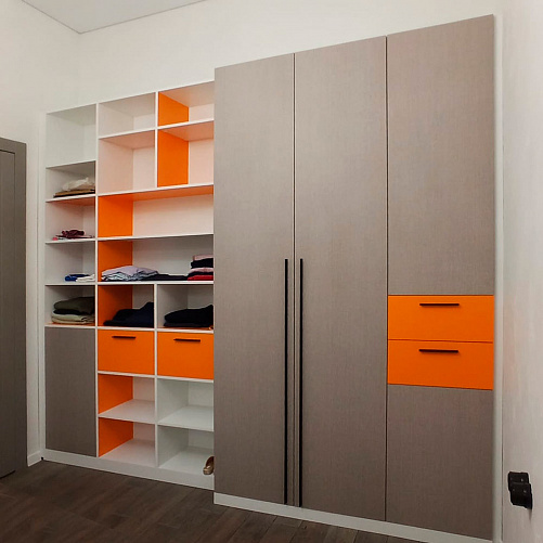 Пространство квартиры-лофта интересно тем, что при небольшой площади комнат они очень высокие. В связи с этим шкафы сделаны так, что верхняя часть их приспособлена для вещей долгосрочного хранения. Чтобы высокие шкафы не казались массивными, использованы на одном и том же изделии панели разного цвета и фактуры. Для расширения пространства зоны прихожей, шкаф сделан с поворотом и зеркальными панелями, чтобы пространство зрительно казалось больше.