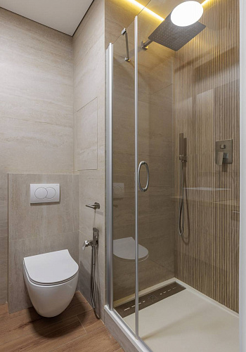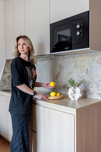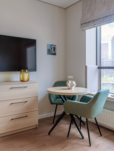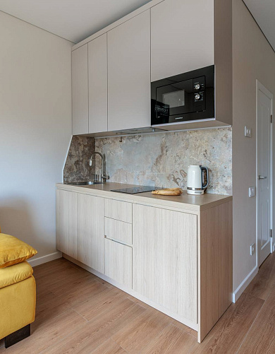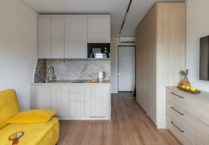 Продуманные решения для небольшой квартиры-студии: компактная кухня, уютная обеденная зона и светлая ванная комната. Стильный и лаконичный дизайн.