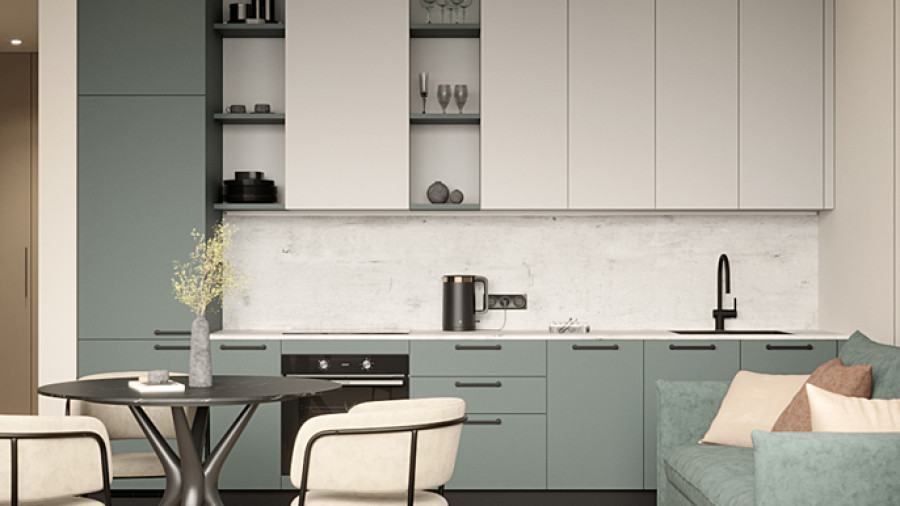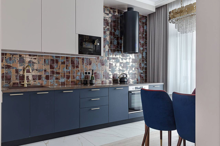 Встроенный шкаф и двери оформлены в едином тоне со стенами — решение, которое визуально делает пространство чище и спокойнее. Минималистичные ручки и аккуратные золотые детали поддерживают общий ритм дизайна. Контраст нижних темно-синих фасадов и светлых верхних шкафов создает гармоничный визуальный баланс. Керамический фартук добавляет живости, отражая свет и меняя оттенки в зависимости от освещения. Матовое золото смесителя и фурнитуры добавляют интерьеру шарма.
