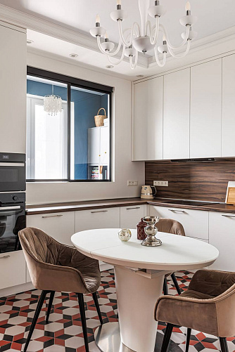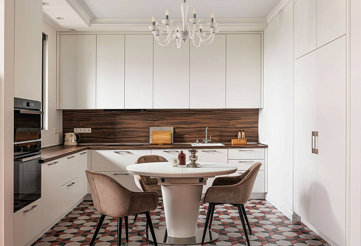 Светлые стены, белый гарнитур и встроенная техника создают ощущение простора, а фартук под дерево добавляют тепла и уюта.