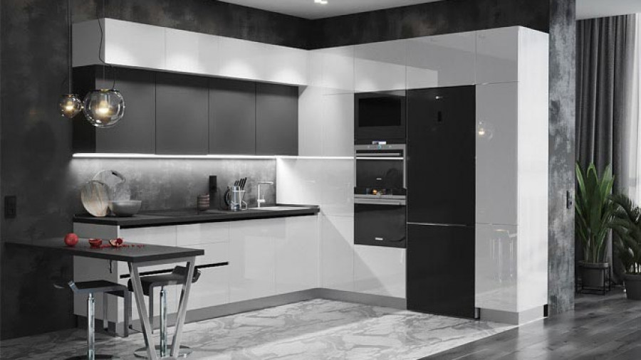 Кухонный гарнитур Лучидо идеально дополнит интерьер в современной стилистике. Угловая конструкция будет одинаково уместной и в маленьких помещениях, и в просторных кухнях, совмещённых с гостиной. Для оформления фасадов используются глянцевые белые и матовые чёрные плиты. Благодаря встроенной подсветке, отражающим свет поверхностям и сочетанию контрастных цветов создаётся эффект глубины. Гарнитур оснащён различными системами хранения, навесными и напольными шкафами, бытовой техникой. Также предусмотрен холодильник и кухонный телевизор. В качестве завершающей детали – обеденный стол на одной опоре.