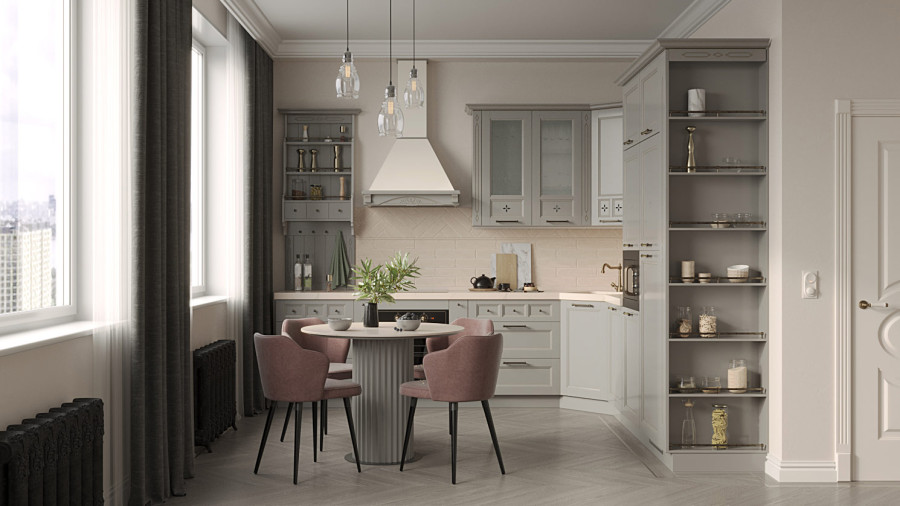 Отдельной фишкой этого проекта считаю искусственно созданную полукруглую нишу, в которую Стильные кухни вписали комод и очень красивые полочки для посуды. Эта ниша была пристроена к несущему пилону, разделяющему кухню и гостиную.