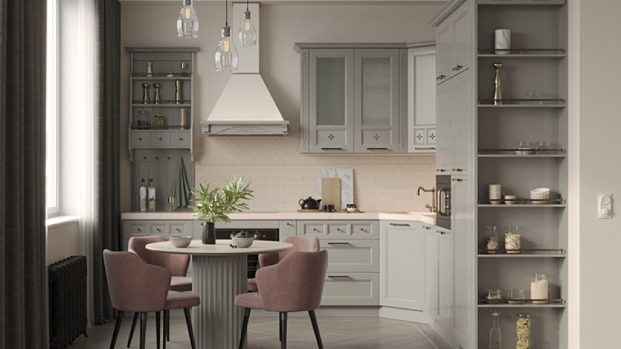 Кухонный гарнитур Оливия выполнен в оригинальном сером цвете. Это образец классического исполнения мебели для современных интерьеров: в дизайне использованы элементы кантри-направления и приёмы неоклассицизма. Рамочные фасады изготовлены из массива и шпона дуба. Поверхности декорированы оригинальной фрезеровкой и патиной. Кухня имеет угловую конструкцию и может использоваться для небольших по размеру помещений. Для хранения принадлежностей предусмотрены распашные шкафы, выдвижные ящики, навесные системы с витражами и открытые полки. Мебель оснащена встроенной техникой и подсветкой.