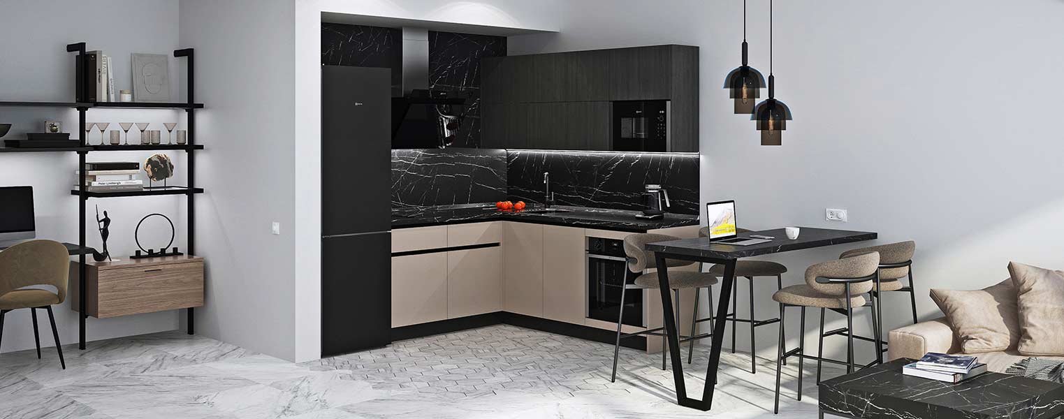 • Красивая кухня с золотыми акцентами в двухкомнатной квартире бизнес-класса