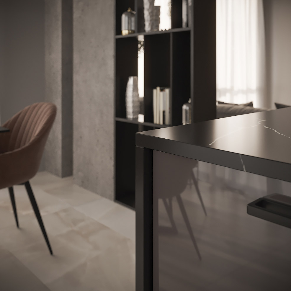 • Красивая кухня с золотыми акцентами в двухкомнатной квартире бизнес-класса