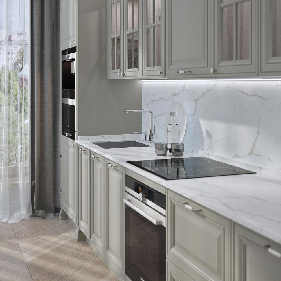 Красивая кухня с золотыми акцентами в двухкомнатной квартире бизнес-класса