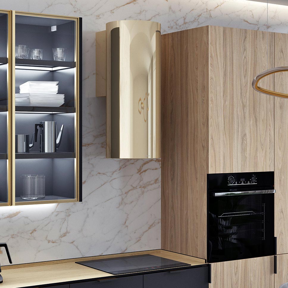 Красивая кухня с золотыми акцентами в двухкомнатной квартире бизнес-класса